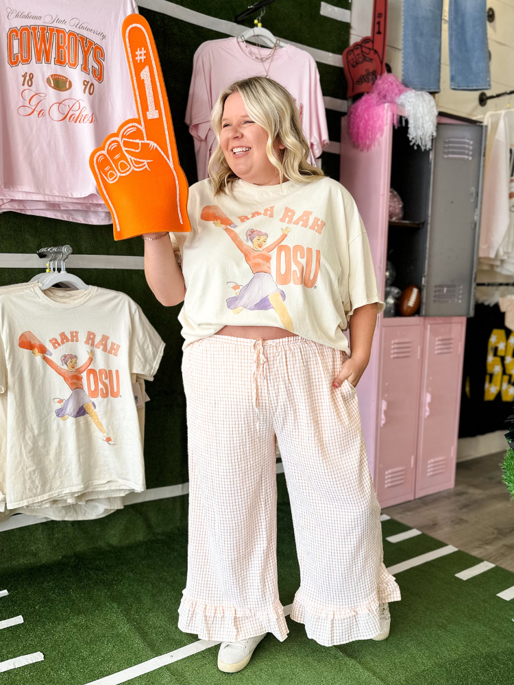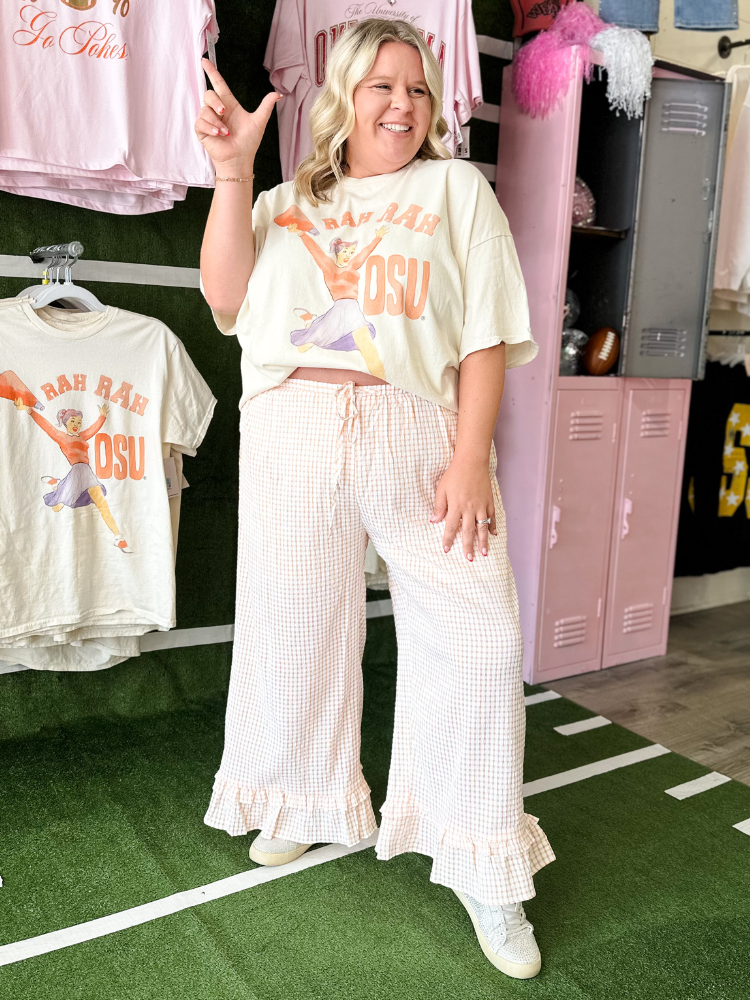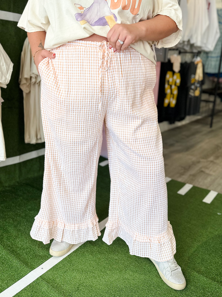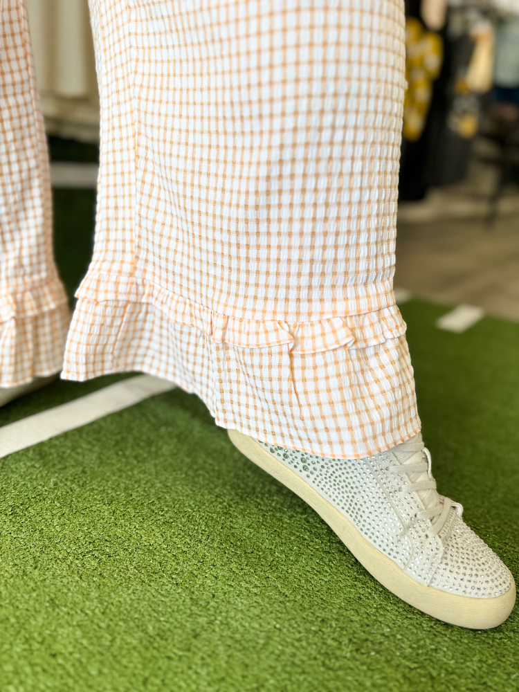 Step into game day with The Reagan Bottoms in Orange. These cropped pants feature a bold checkered pattern and playful ruffled details, combining style and comfort effortlessly. Perfect for showing off your team spirit while staying chic and confident all day long. Elevate your casual wardrobe with a vibrant pop of color and unique design that turns heads wherever you go.