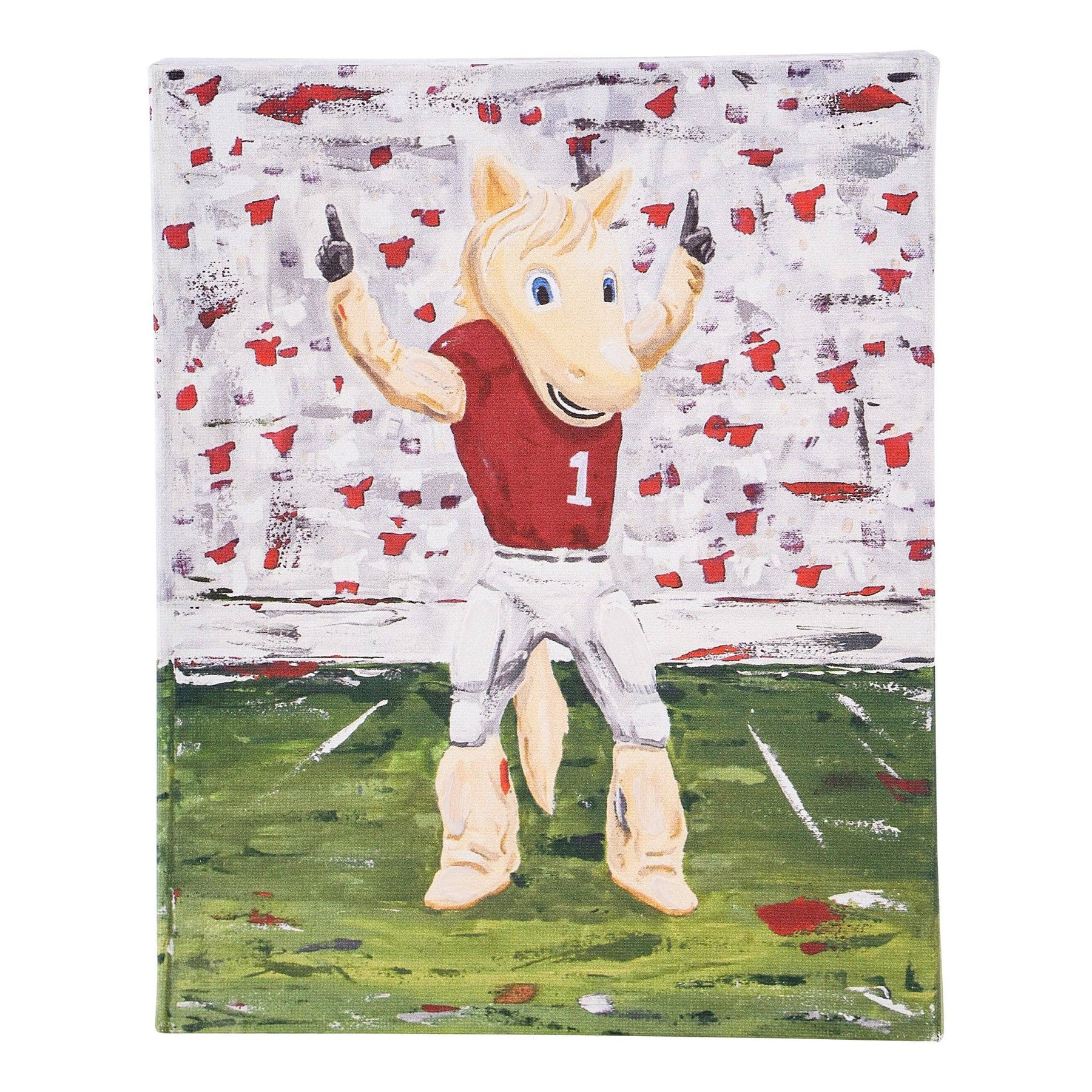 Bring your University of Oklahoma pride front and center when you proudly hang this Sooner Mascot Wall Art in your home, office, or dorm! This small, hand-painted canvas is perfect for any fan, alumni, or student who wants to add a little Crimson & Cream to their decor to remind them of their favorite university and team! This design features Sooner the mascot in the Palace being cheered on by countless fans! Boomer Sooner! * Original Design * Dimensions: 8" x 10" * Comes ready to hang.