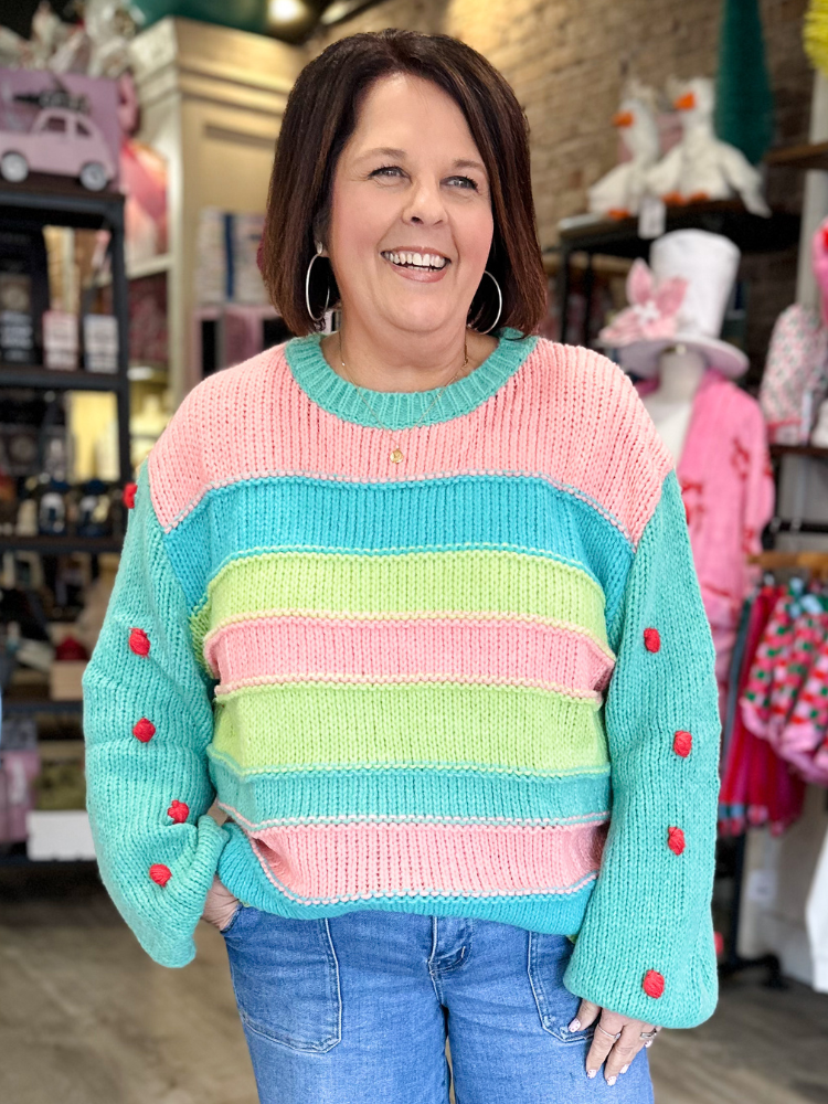 The Lilly Sweater brings effortless sophistication to your everyday rotation. This boatneck pullover features a striking color-block design that pairs beautifully with neutrals or bold pieces alike. Playful pom pom details on the sleeves add a touch of whimsy, while the soft knit construction ensures all-day comfort. Perfect for layering or wearing solo, this emerald mix sweater transitions seamlessly from casual weekends to polished office days.