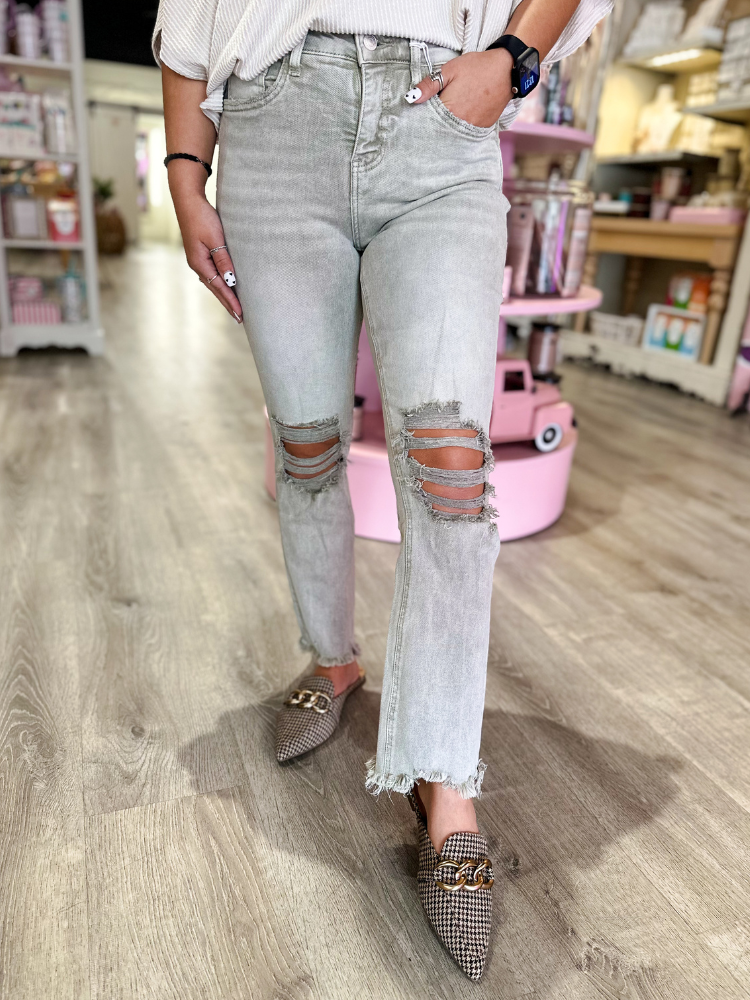 Elevate your fall wardrobe with the Autumn Vintage High Rise Crop Flare jeans. Designed with a flattering high-rise fit and tummy control, these jeans offer a sleek silhouette and extra comfort. The cropped flare cut adds a trendy edge, while subtle distressing brings vintage charm. Perfect for effortless style and confidence all season long.