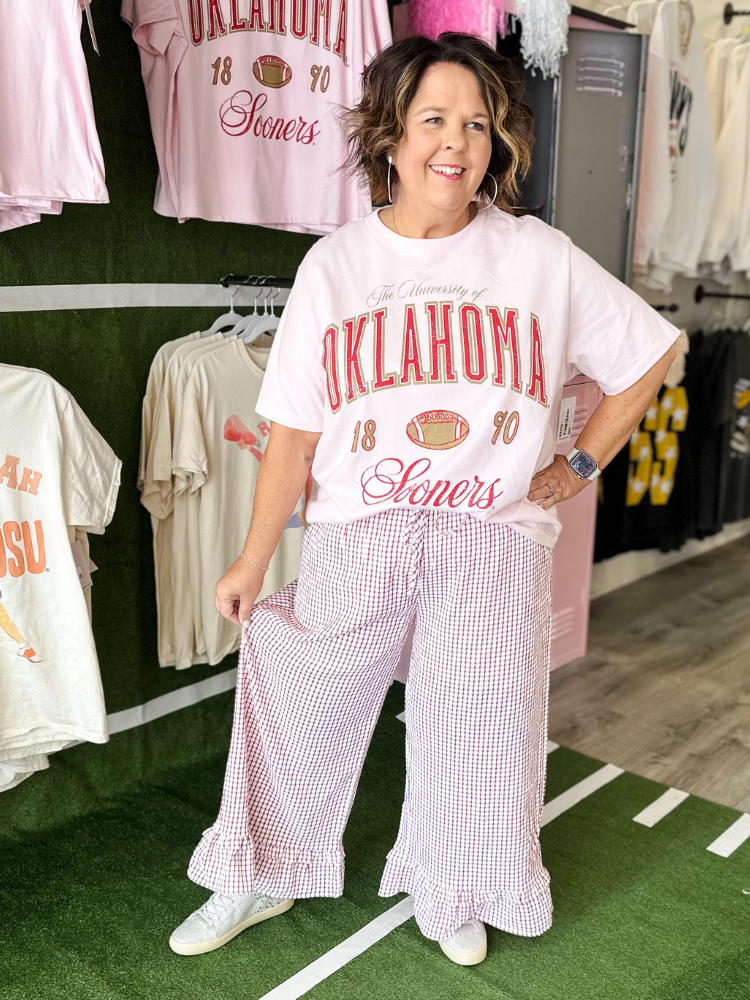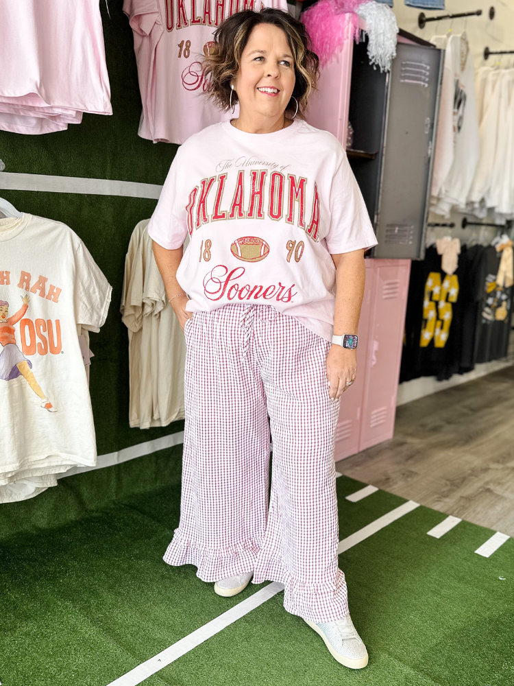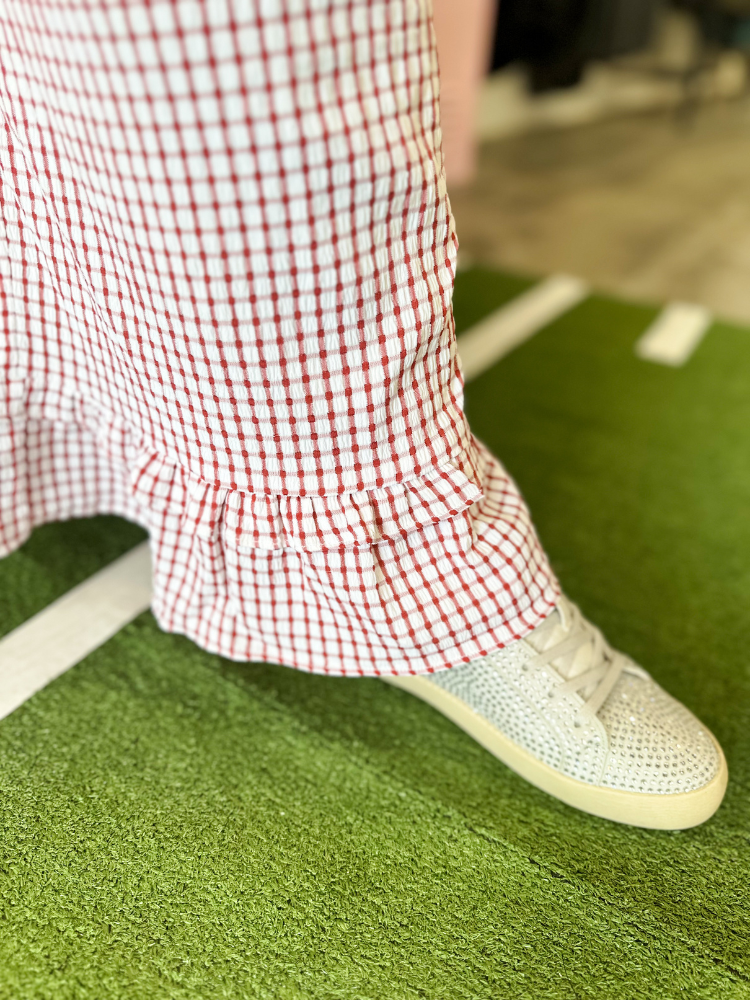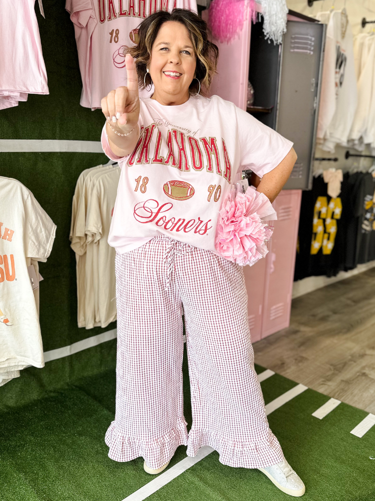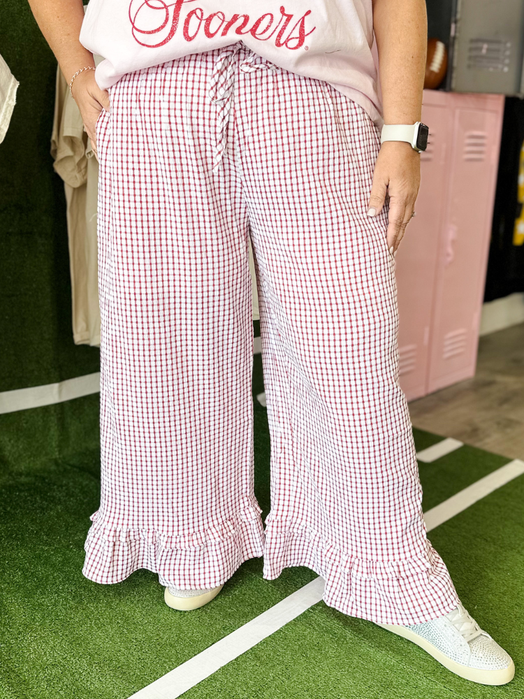 Step into game day with The Reagan Bottoms in Dark Red. These pants feature a bold checkered pattern and playful ruffled details, combining style and comfort effortlessly. Perfect for showing off your team spirit while staying chic and confident all day long. Elevate your casual wardrobe with a vibrant pop of color and unique design that turns heads wherever you go.