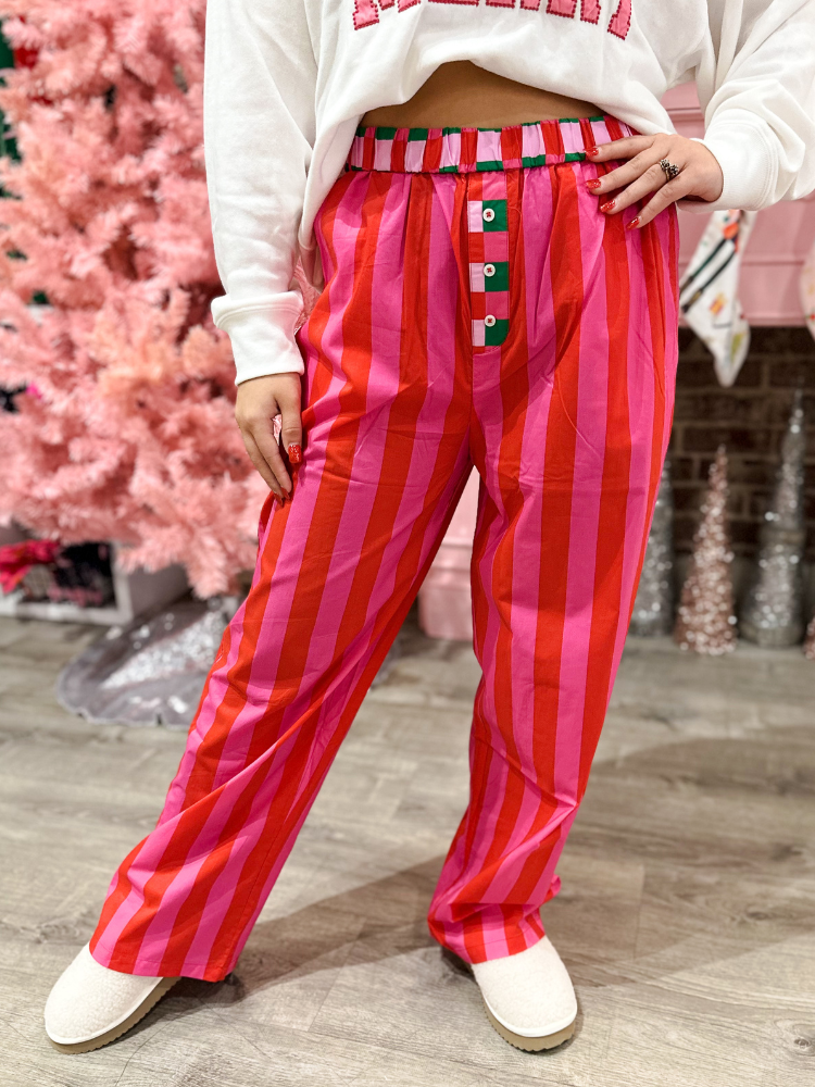 Wrap yourself in holiday cheer with these festive striped boxer-style pajama pants! Featuring a cheerful pink and red stripe pattern, they're perfect for cozy nights during the Christmas season. The relaxed boxer cut offers comfort and ease of movement, while the soft fabric keeps you warm and snug. Whether you're lounging by the tree or settling in for a winter's nap, these festive pants bring playful holiday spirit to your sleepwear collection. Celebrate the season in style and comfort!