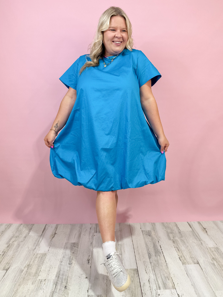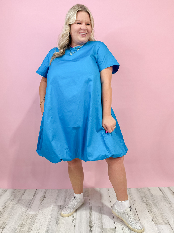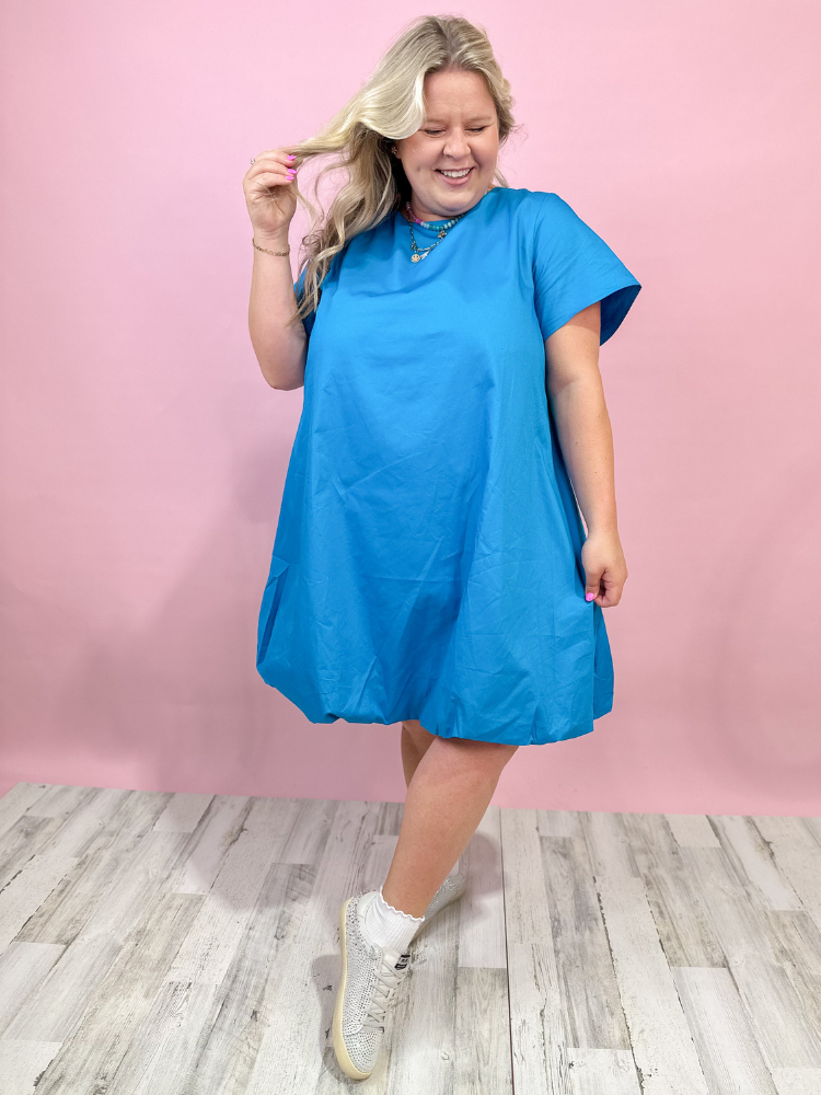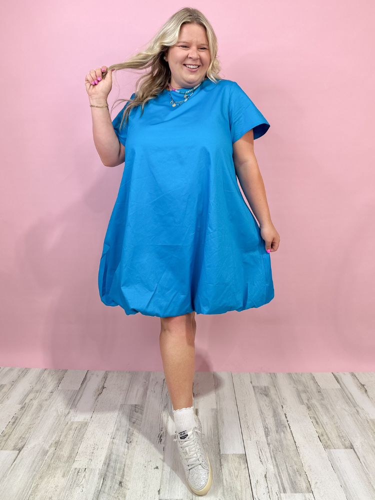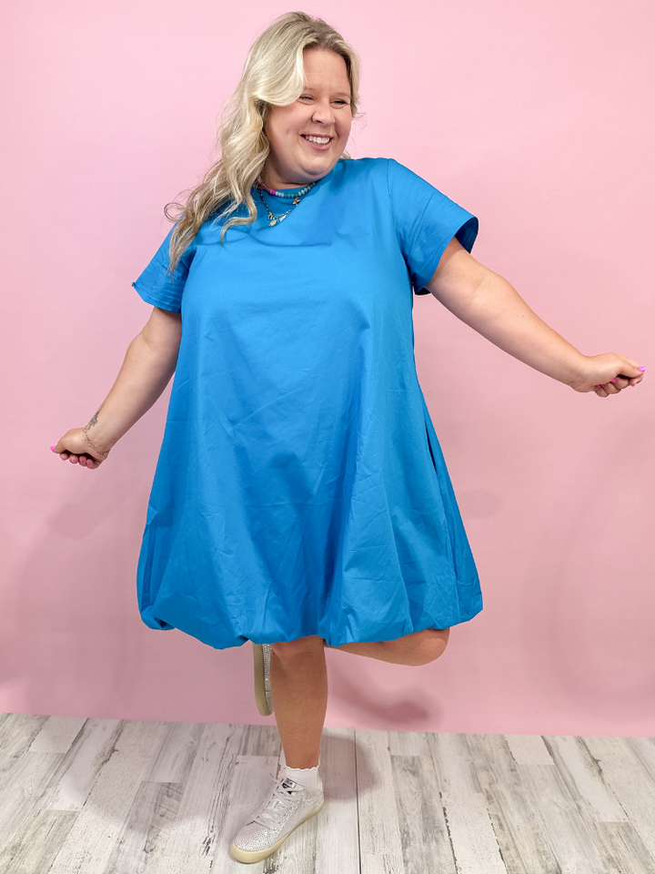 The Cora Dress in Cobalt Blue features short sleeves and a playful bubble silhouette that adds volume and movement. Its vibrant color and flattering shape make it a standout choice for any occasion, effortlessly combining comfort with bold style. Perfect for those who want to make a confident statement with ease.